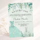 A trendy invitation for a Quinceañera, 15th birthday party, enchanted forest theme. A green watercolored background with ferns and eucalyptus greenery, a green dress. The name is written with a modern hand lettered style script. Personalise and add your party details.