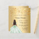 A faux gold looking background. Decorated with golden stars and a girl wearing a green dress. Personalise and add a name and details.