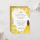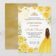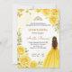Quinceañera invitation with elegant yellow roses and a gown design. Text includes event details. Background is a light, marble-like surface.