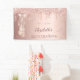 A welcome banner for a girly and glamourous Quinceañera, 15th birthday party. A faux rose gold metallic looking background with an elegant faux rose gold, pink glitter drips, paint dripping look and a pair of ballerina shoes. Personalise and add a name. The name is written in dark rose gold with a modern hand lettered style script.
