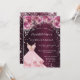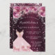 A modern, stylish and glamourous invitation for a Quinceañera, 15th birthday party. A burgundy faux metallic looking background with pink faux glitter dust, a dress and pink florals. The name is written with a modern hand lettered style script. Personalise and add your party details.
