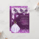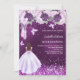 For an elegant Quinceañera. A purple uneven coloured background. Decorated with confetti, ballerina toe shoes, butterflies, roses and a girl in a dress. Personalise and add a name, age/text and party details. The name is written with a hand lettered style script