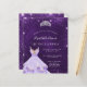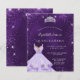 A modern, stylish and glamourous invitation for a Quinceañera, 15th birthday party. A deep purple background with faux glitter dust, a tiara and a dress. The purple colour is uneven. The name is written with a modern hand lettered style script. Personalise and add your party details.