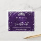 A glamourous Save the Date card for a Quinceañera, 15th birthday party. A purple uneven coloured background. Decorated with faux silver glitter sparkles and a tiara. The text: Save the Date is written with a large trendy hand lettered style script.