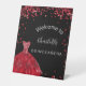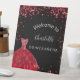 A welcome sign for a Quinceañera, 15th birthday party. A black background with red faux glitter, sparkles, a dress. Personalise and add a name.