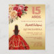 A modern, stylish and glamourous invitation for a Quinceañera, 15th birthday party. A faux gold background, a girl wearing a red and gold dress and red, pink and golden roses, florals. The name is written with a modern hand lettered style script. Personalise and add your party details.