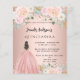 A modern, stylish and glamourous invitation for 2 Quinceañeras, 15th birthday parties. A rose gold background decorated with blush pink flowers, florals, and a girl wearing a ball gown. The names are written with a modern hand lettered style script. Personalise and add your party details.