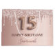 Elegant, classic, glamourous and girly for a Quinceañera, 15th birthday party. Rose gold and blush pink, gradient background. Decorated with rose gold, pink faux glitter drips, paint dripping look. Personalise and add a name. With the text: Happy Birthday. The name is written with a modern dark rose coloured hand lettered style script. Number 15 is written with a balloon style font.