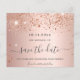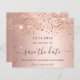 A girly and trendy Save the Date card for a Quinceañera, 15th birthday party. A feminine pink, rose gold faux metallic looking background decorated with faux rose gold glitter dust. Personalise and add a date and name/age. Dark rose gold coloured letters. The text: Save the Date is written with a large trendy hand lettered style script.