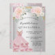 A modern, stylish and glamourous invitation for a Quinceañera, 15th birthday party. A faux silver metallic looking background with pink faux glitter dust a dress and blush pink florals. The name is written with a modern hand lettered style script. Personalise and add your party details.