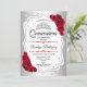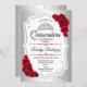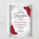 Silver white Quinceanera celebration invitation. Features script font, red roses, tiara and confetti. Classy design with faux glitter silver. Perfect for an elegant princess style glam celebration. Personalise with your own details. Printed Zazzle invitations or instant download digital printable template.