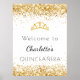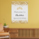 A welcome poster for a girly and glamourous Quinceañera, 15th birthday party. A stylish white background decorated with faux gold glitter dust and a tiara, crown. Personalise and add a name.