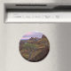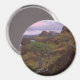 Round photo magnet of a tree in front of the mountains of the Quiraing landscape with pink colours in the sky at sunrise at Trotternish Ridge on the Isle of Skye in Scotland, UK.