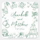 Personalised Hand-Drawn Quirky Wedding Stickers. These fun and playful square wedding stickers feature quirky doodle illustrations surrounding the design, all in a vibrant emerald green theme. Elements like a champagne tower, wedding cake, disco ball, hearts, wedding bells, rings, cameras, and more create a whimsical and celebratory vibe. The bride and groom's names and wedding date are elegantly displayed beneath the artwork in a mix of handwritten script and simple fonts, adding a stylish and personalised touch.