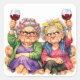 Two elderly women with grumpy yet playful expressions sit on a couch, each holding a glass of red wine