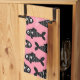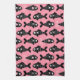 A fun and modern seamless block print style fish pattern featuring rows of black fishes on a soft pink background with occasional pops of pink tails. Ideal tea towel gift for lovers of marine life! Small scale. Available in other colours