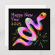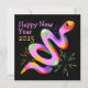 This elegant New Year card design features a quirky snake with colourful fireworks on a black background.