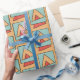 Fun, quirky, vintage, retro style, abstract pattern, with funky geometric shapes of squares and triangles in red and blue on an orange background.