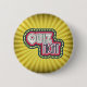 Quiz night trivia party pin back button. With big bold typography surrounded by dressing room lights. The background is a yellow sunburst pattern.
