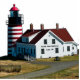 An image of the Quoddy Head lighthouse cut out of a sturdy acrylic plastic. The white background will be removed so the sculpture is the shape of lighthouse tower, keepers house and grounds. This is the most eastern lighthouse in the US. Beautiful tower of red and white stripes.