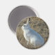 Snowshoe Hare Round Magnet. Sometimes even mother nature's plan is fouled up by the weather, this snowshoe hare has changed into it's white winter coat but the winter snows are late and instead of being camouflaged it now stands out against the brown prairie grass.