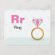 Letter R is for Ring in our Alphabet Flash Card set. Get all 26 letters of the alphabet! A double-sided postcard that is great for memory games and teaching, geared for education, schools, teachers and homeschool for kindergarten and babies. All text is editable if you need to customise.