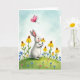 Designed with a soft watercolor look, this card shows a white bunny 🐰 with rounded features and pink-lined ears sitting on a gently rolling green hill. A faint blush on its cheeks and the way it leans into a yellow coneflower at its nose gives the scene a sweet, almost affectionate mood. Around the bunny, tall yellow coneflowers with brown centers rise like friendly companions, while tiny blue and pink blossoms sprinkle the grass like confetti. Near the top portion, a short Easter greeting appears in a light, easy-to-read font, set in a warm pastel tone that stands out against the pale sky. The background stays airy with a light blue wash, keeping the focus on the bunny and flowers 🌷. A small butterfly with deep red wings floats above, adding a gentle sense of motion. The hill fades softly at the lower edge, with scattered petals and specks of color tucked into the grass. Share Easter sentiments with someone you care about.
