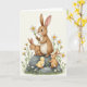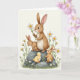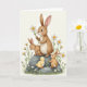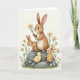 This card shows a gentle spring scene with a tall brown rabbit standing upright and offering a small white flower with a sunny yellow centre, its rosy cheeks and soft smile aimed down like a caring friend 🐰. Below, two smaller rabbits sit close together on cool grey rocks, their bodies angled inward as if sharing a quiet moment. The left little rabbit looks down with a shy, thoughtful tilt of the head, while the right one gazes up at the taller rabbit with bright, admiring eyes 🐇. Between them, a tiny yellow chick stands nestled in the middle, adding a sweet point of connection among the trio. Around the rocks and along the foreground, green stems and grass are dotted with white daisy-like blooms that frame the group like a garden border. The background stays a soft off-white, letting the warm browns, gentle greys, and fresh greens stand out without distraction. A short Easter greeting sits near the top in a light, spring-toned colour, with smaller text placed beneath it in a darker shade for contrast. The flower’s white petals and golden centre are the sharpest details, held just above the smaller rabbits’ ears.