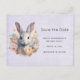 Save the date postcard with a sweet and adorable watercolor image. A bunny rabbit with white and gray fur. A garland of carnation flowers in pastel colors of pink and peach. A cute Easter, birthday or baby shower image for bunny rabbit lovers.