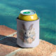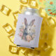 Can cooler with a sweet and adorable watercolor image. A bunny rabbit with white and gray fur. A garland of carnation flowers in pastel colors of pink and peach. A cute Easter, birthday or baby shower image for bunny rabbit lovers.