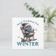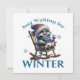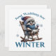 Celebrate the cosy spirit of the season with this charming Christmas card featuring a whimsical raccoon lounging on a rocking chair, swinging gently while savouring a glass of red wine. The playful caption, "Just waiting for winter," adds a dash of humour and warmth, perfect for spreading cheer to friends and family who enjoy the finer (and cosier) things in life