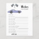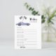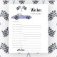 Race car theme baby shower invitation card featuring watercolor illustrations of a purple (violet) vintage car and black - white race flag. "Race on over for a baby shower."