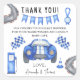 Race car theme baby shower invitation card featuring watercolor illustrations of a blue race car.