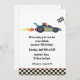 A fun birthday party invitation with a race car theme. Design features a blue race car and chequered flag with black and white chequered bottom border.