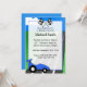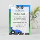 Road background with a blue racing car and chequered flag. Great Birthday invitation for boys or girls who love racing.