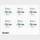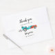 Cute race car theme birthday party favour sticker featuring illustration of blue vintage car with red flame. The text says "thank you for racing by."