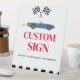 Sign for a child's second birthday party with a racing car motif and a depiction of a blue automobile with flames. "cstom sign," according to the paragraph.