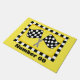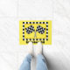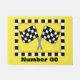 Welcome your guests with this race doormat that is great for a home or office. Customise with your favourite race number at the bottom or personalise with a name or other word such as welcome. The flag features two black and white chequered flags waving and is surrounded by a black and white checked border. The backround is yellow. This can be a fun gift to say congratulations to someone who has won race, whether motor, auto or motorcycle, or any race with a chequered flag. Fully customisable.