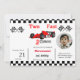 Growing Up Two fast vehicles twin boys 2nd birthday racing on these adorable kids' birthday party invitations with a red car race. Cute race car theme for a 2nd birthday party with an illustration of a red vintage automobile and the phrases "Growing up too fast."