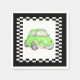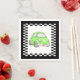 You will love this black and white chequered flag with a lime green watercolor cartoon character car. Matching baby Shower and birthday party invitations to match.