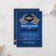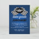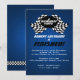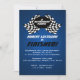 Finished, done, Retired! Celebrate retirement with this fun chequered flags racing theme invitation in blue.