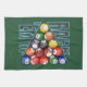 Rack Em Up for pool players and pool sharks. Racked billiard balls with a green pool table background.