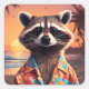 Funny Racoon wearing a hawaiian shirt on a beautiful beach.