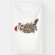 Mischievous racoon wearing a tilted Santa hat, tangled in glowing Xmas lights with a stolen cookie in paw. Vector firefly sparkles around its masked eyes.