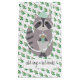 This delightful raccoon is ready for cold winter days with his green knit hat and favorite hot beverage. The background is a pattern of green holly with red berries. The text "cold days•hot drinks" can be personalized by adding your own text or a name.