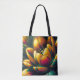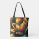 This digital artwork features a vibrant, abstract representation of a tulip in full bloom. The intricate design showcases a mesmerising blend of colours, including vivid yellows, oranges, and hints of teal, creating a stunning visual effect.