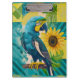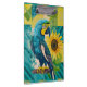 The picture shows a magnificent ara with deep blue feathers and a striking yellow beak that stands majestically on a branch. Accompanied by a bright sunflower and tropical leaves, it radiates warmth and exotic elegance. The dynamic colors and patterns create a sense of freedom and natural beauty.