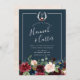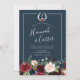 Our Radiant Bloom wedding invitation frames your wedding details with a top border of painted watercolor flowers and foliage in rich jewel tones of burgundy marsala, navy blue, cerise, blush and green. A modern yet organic choice in vibrant colours with lush botanicals and your names in handwritten lettering. Personalise with your single initial monogram at the top surrounded by white antlers adorned with matching flowers.