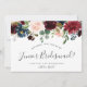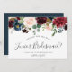 Chic floral bridal party proposal card features a top border of burgundy marsala, blush pink and navy blue flowers, with lush botanical foliage and greenery. Personalise with your junior bridesmaid request details (shown with "will you be my jr bridesmaid? I can't say I do without you") in modern hand lettered script and traditional sans serif lettering. Invitations reverse to rich jewel toned navy blue.