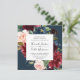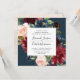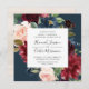 Our Radiant Bloom floral wedding invitation in a unique square format frames your wedding details with painted watercolor flowers in blush pink, burgundy marsala and navy blue, with green eucalyptus foliage against a rich navy background. A modern yet organic choice for fall and winter weddings featuring fresh green foliage, lush florals and handwritten lettering.